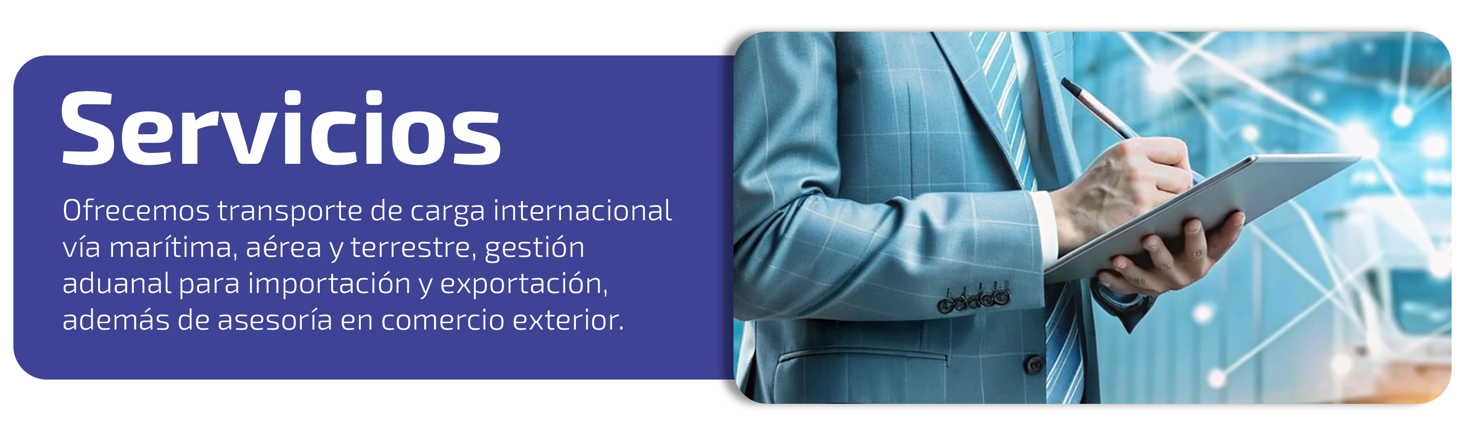 Nuestros principales servicios son el transporte de carga internacional de mercancías en modalidad marítima, aérea y terrestre, coordinación de despachos aduanales en importación y exportación, asesoría en comercio exterior y contratación de seguro de mercancías.