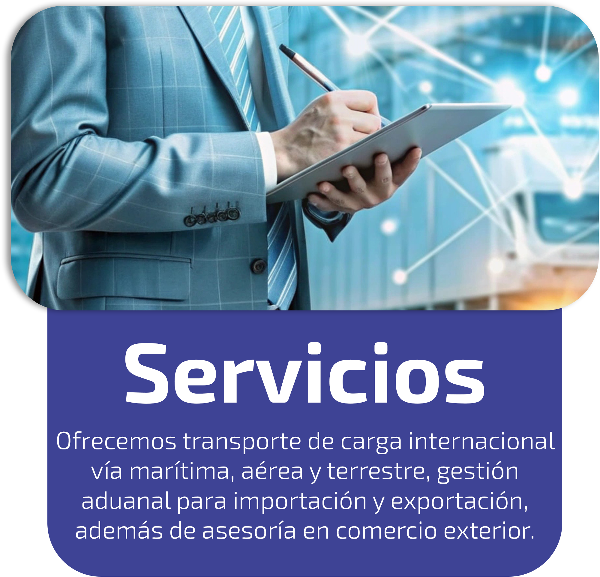 Nuestros principales servicios son el transporte de carga internacional de mercancías en modalidad marítima, aérea y terrestre, coordinación de despachos aduanales en importación y exportación, asesoría en comercio exterior y contratación de seguro de mercancías.